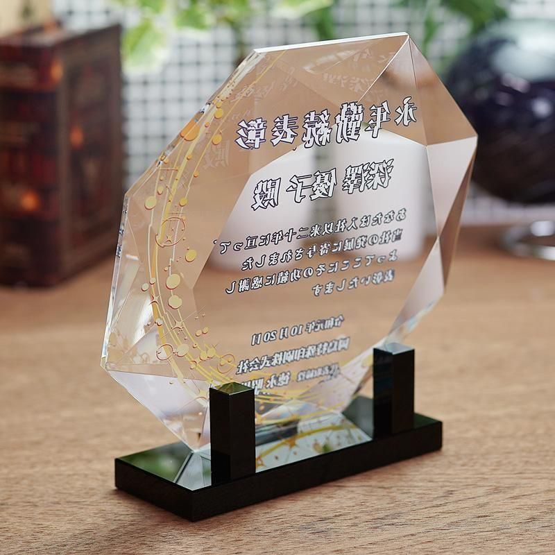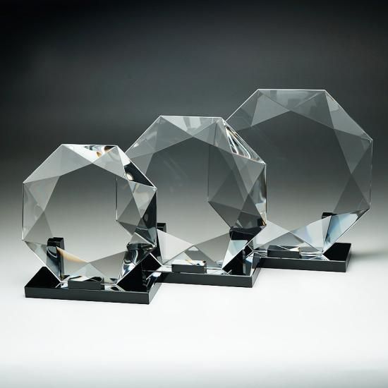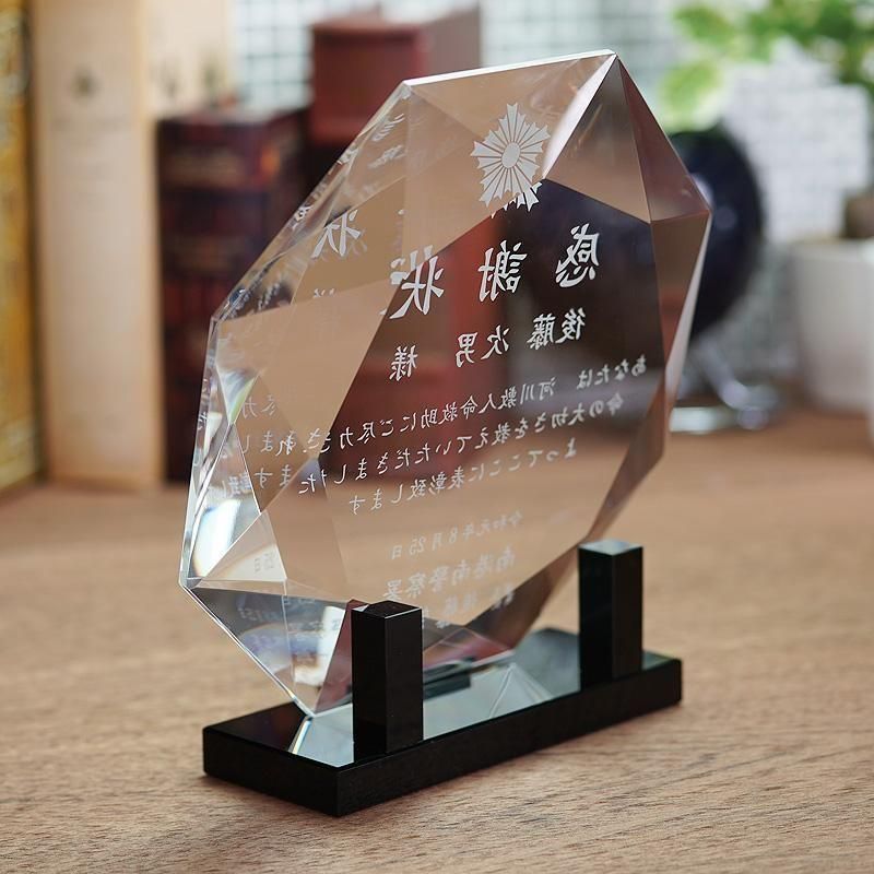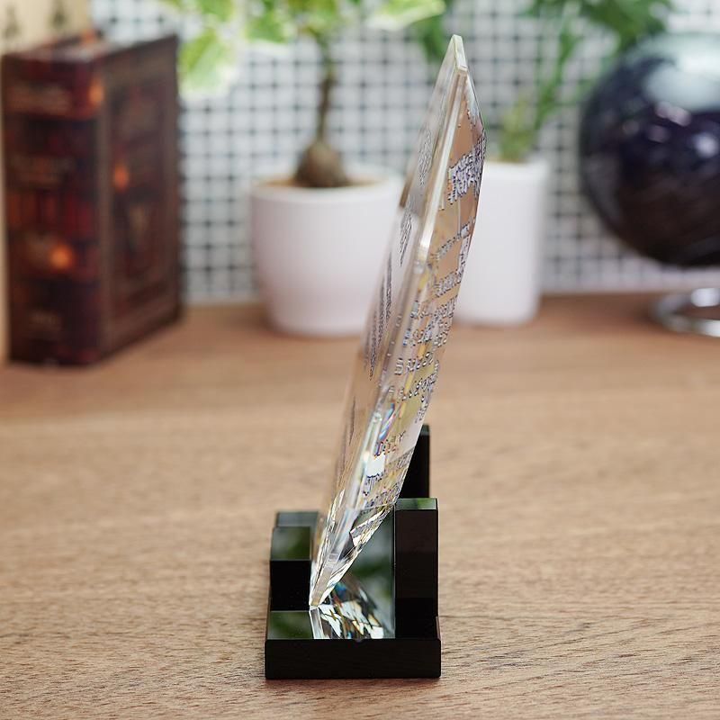 シンプルなデザインに背面側のカットが光を美しく反射する、高貴な雰囲気のクリスタル表彰盾です。 付属の黒ガラスの台座でさらに高級感をプラス。