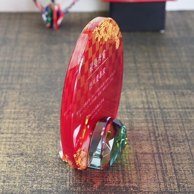 ホログラム加工のスタンドがアクセントの多用途に使えるクリスタル盾です。