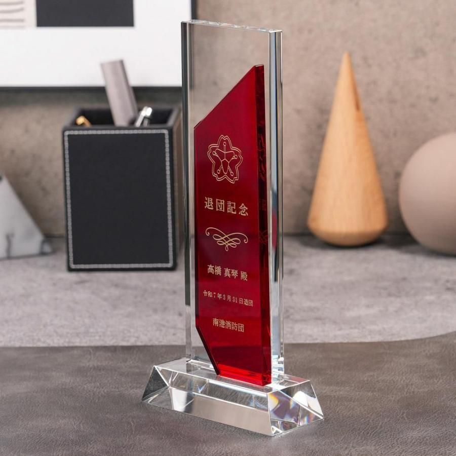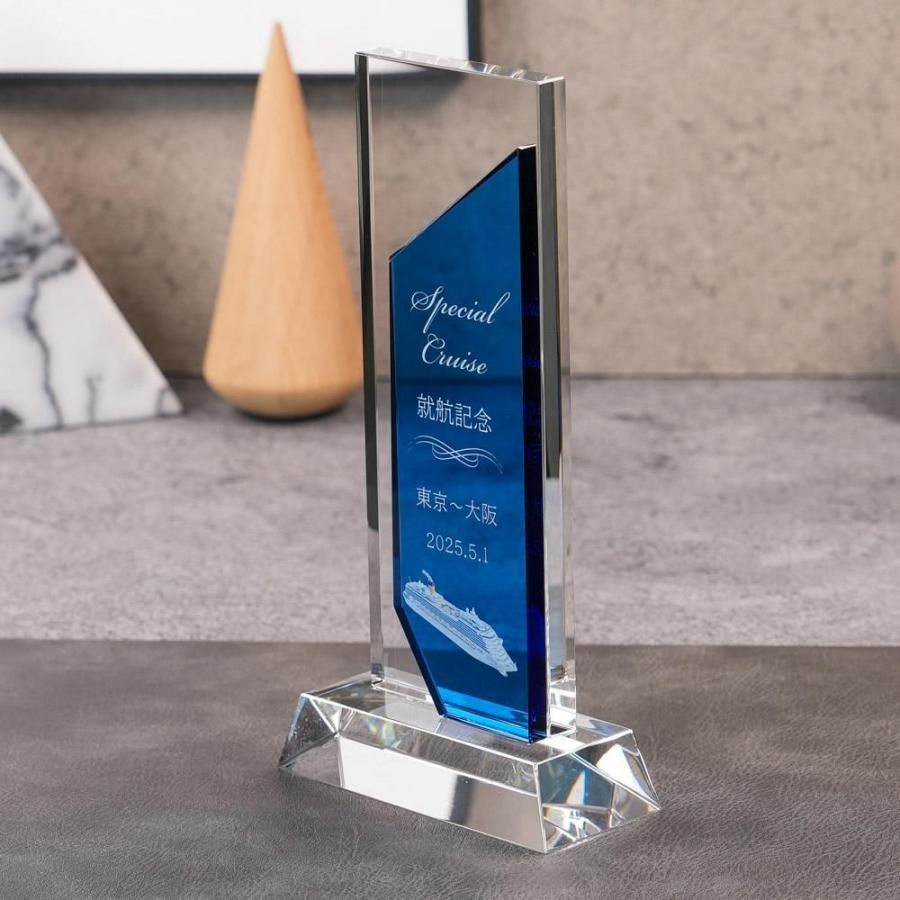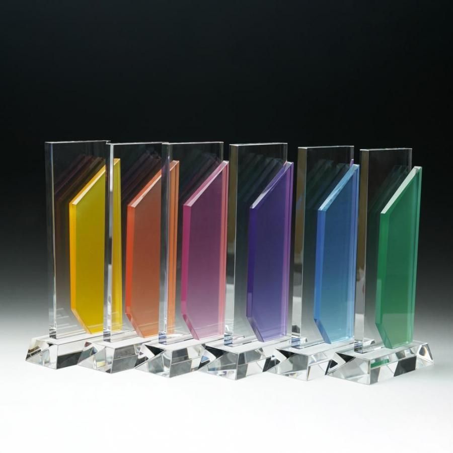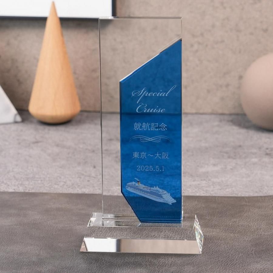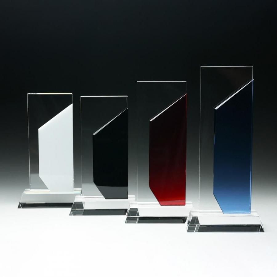 右上がりのシャープな色ガラスが特徴的なトロフィーです。