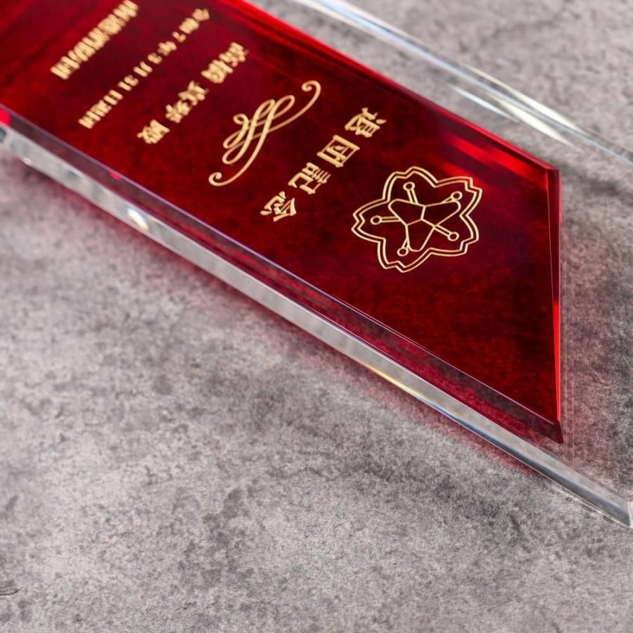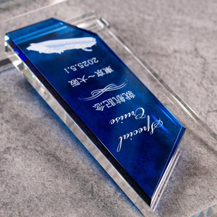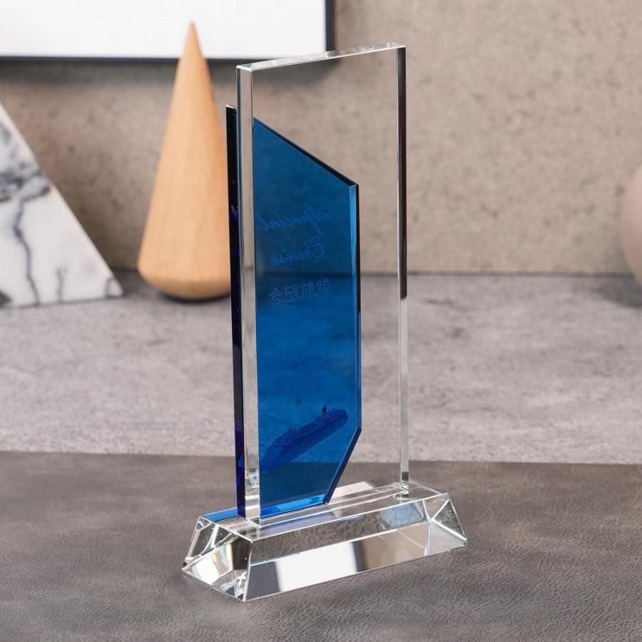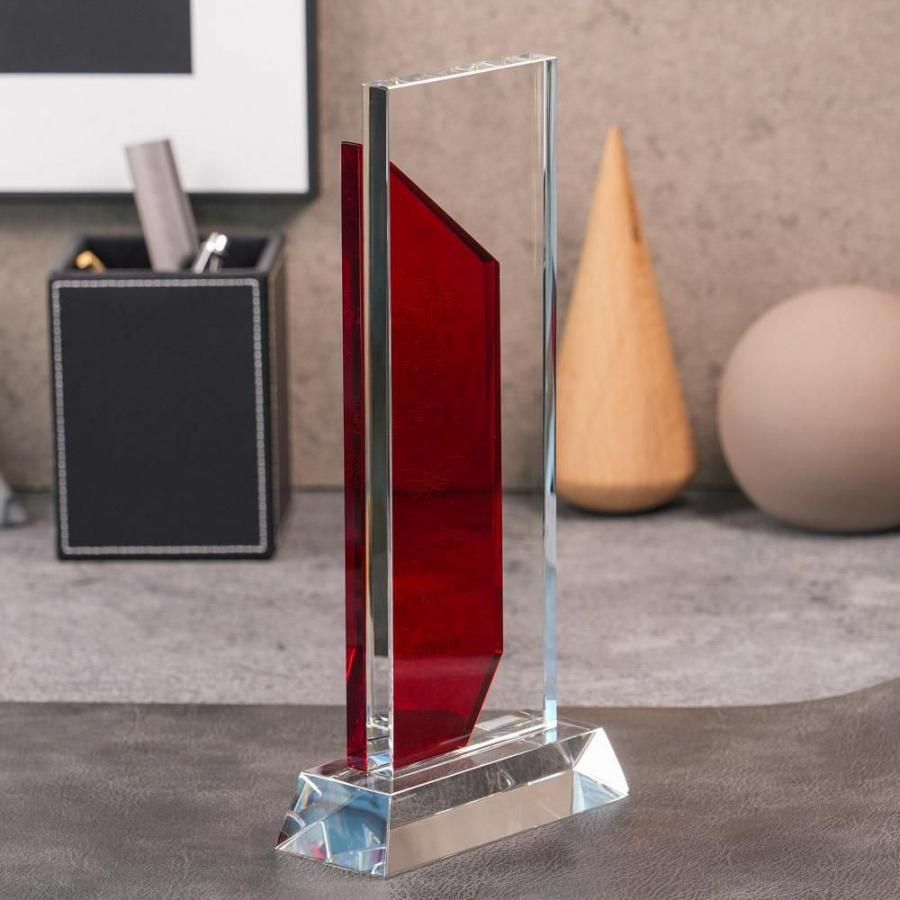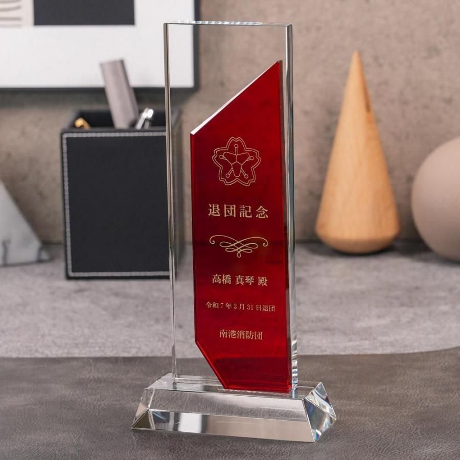 右上がりのシャープな色ガラスが特徴的なトロフィーです。