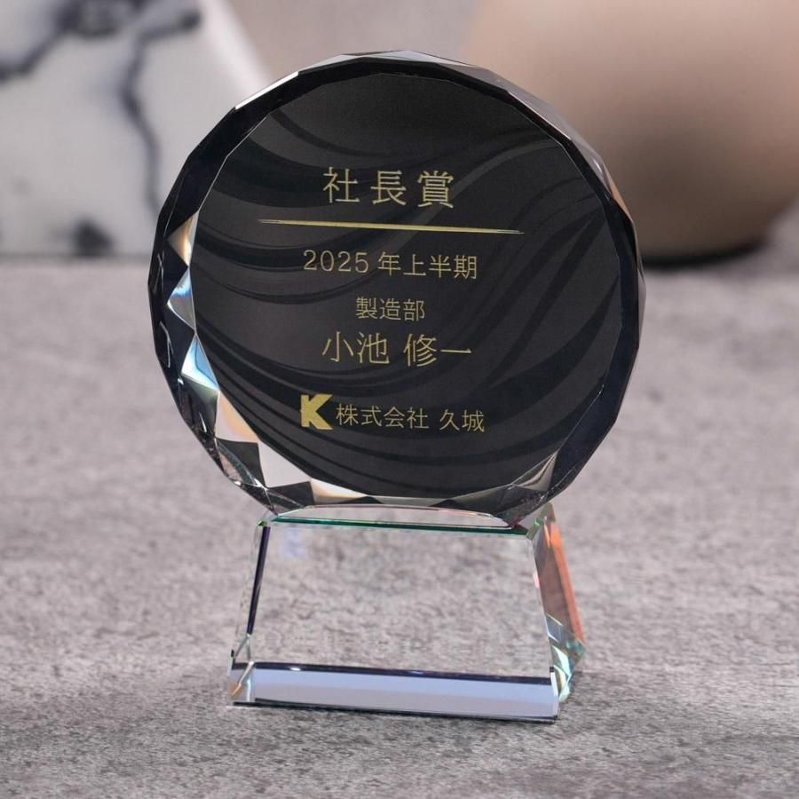 側面のダイヤカットがキラキラと光を反射させるサークル状のクリスタルトロフィーです。